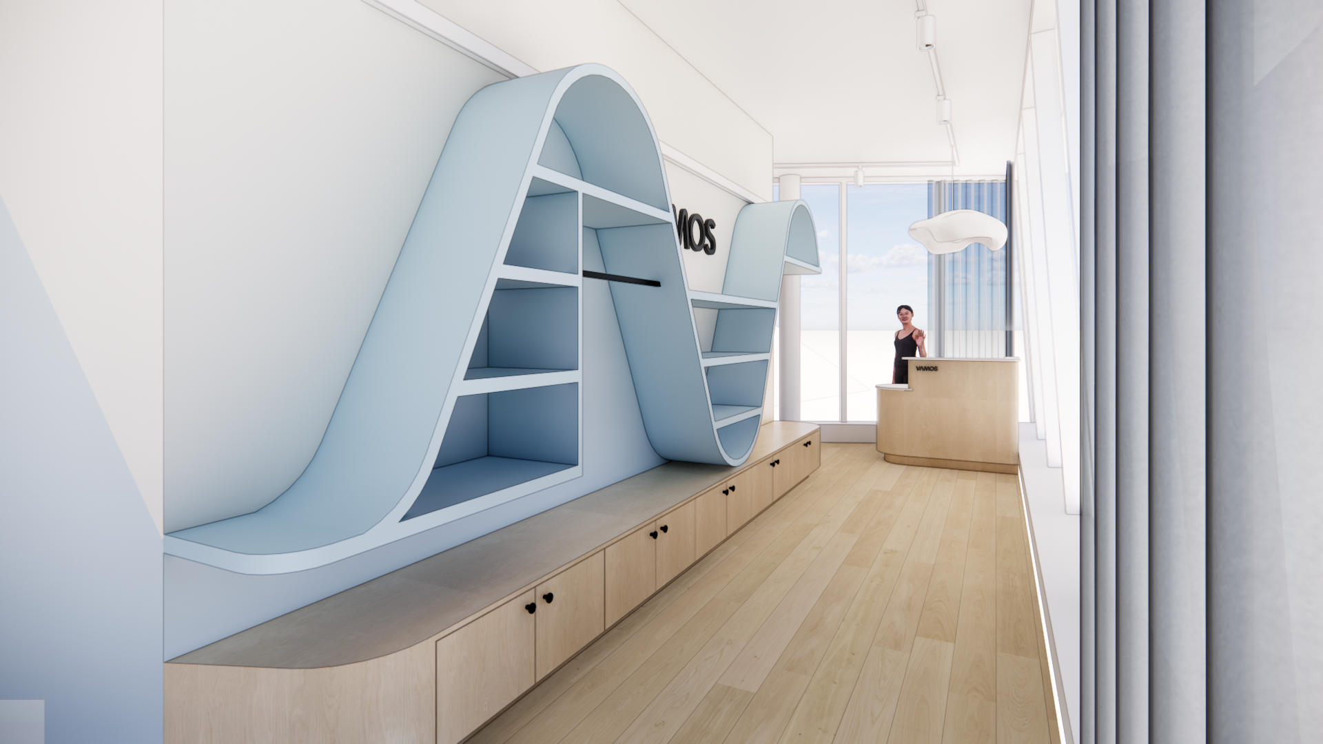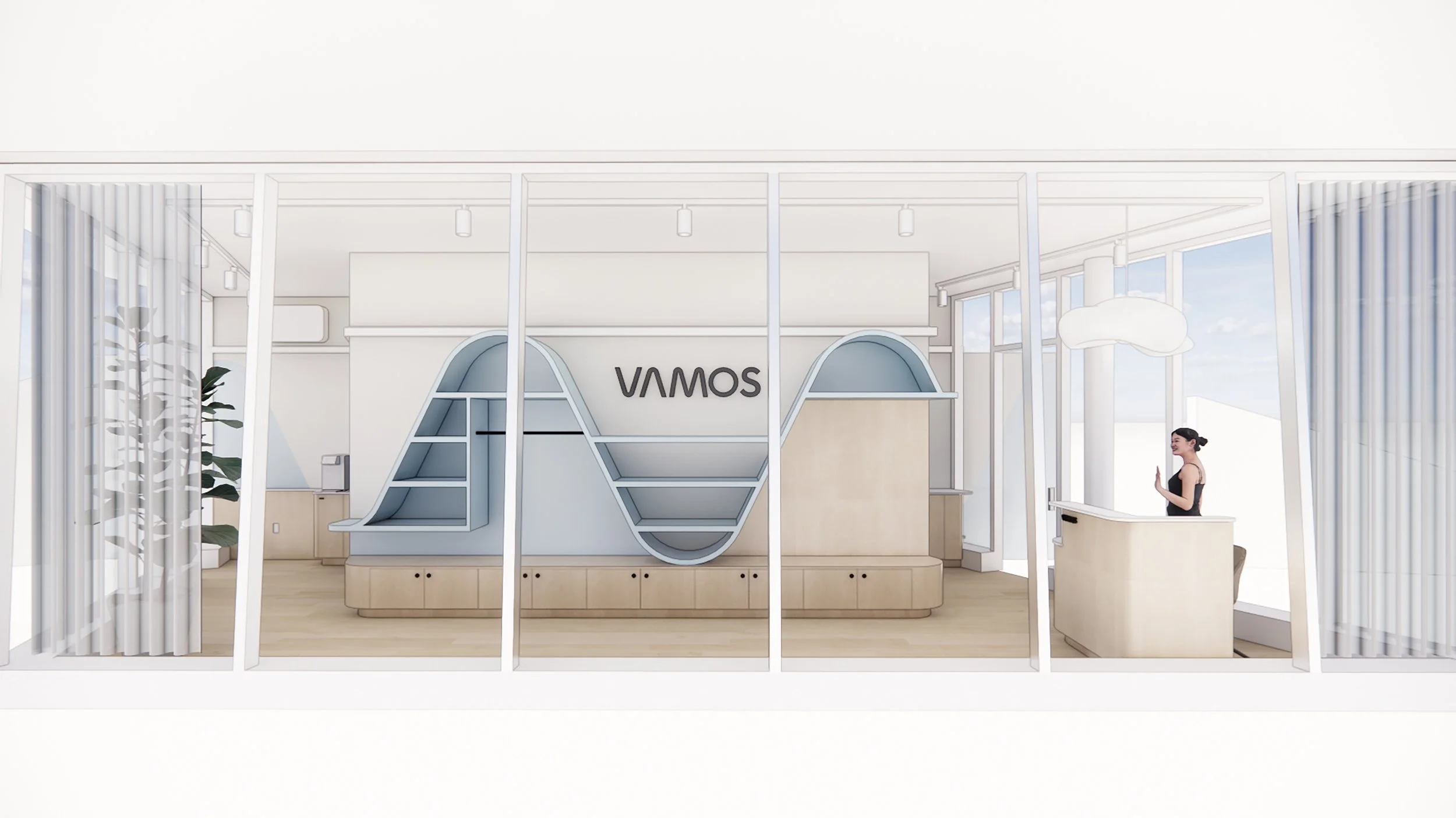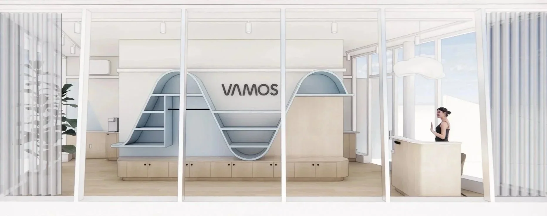 That idea of movement became one of the most defining design moves in the space. Instead of relying on signage or decals, we pulled the wave from the Vamos logo and translated it directly onto the interior walls. The painted “bounce” meets you when you arrive and stays with you as you check in, browse, and head toward the courts. To make it feel intentional, the curve was mapped across the full back wall—unfolded, plotted, and documented with clear reference points so it wraps seamlessly across corners and transitions. Paint let us carry the brand’s motion through the architecture in a way that’s precise, flexible, and integrated—without needing heavy construction to make the statement.