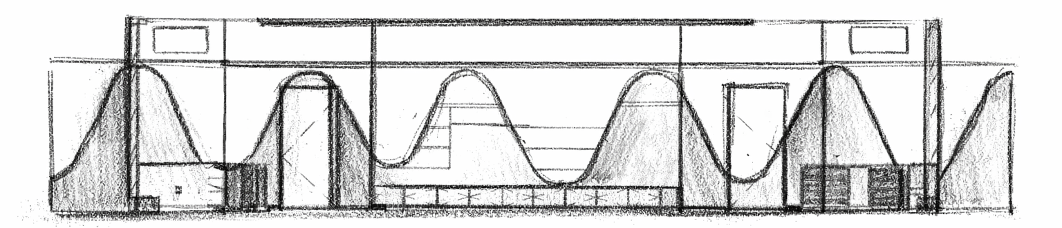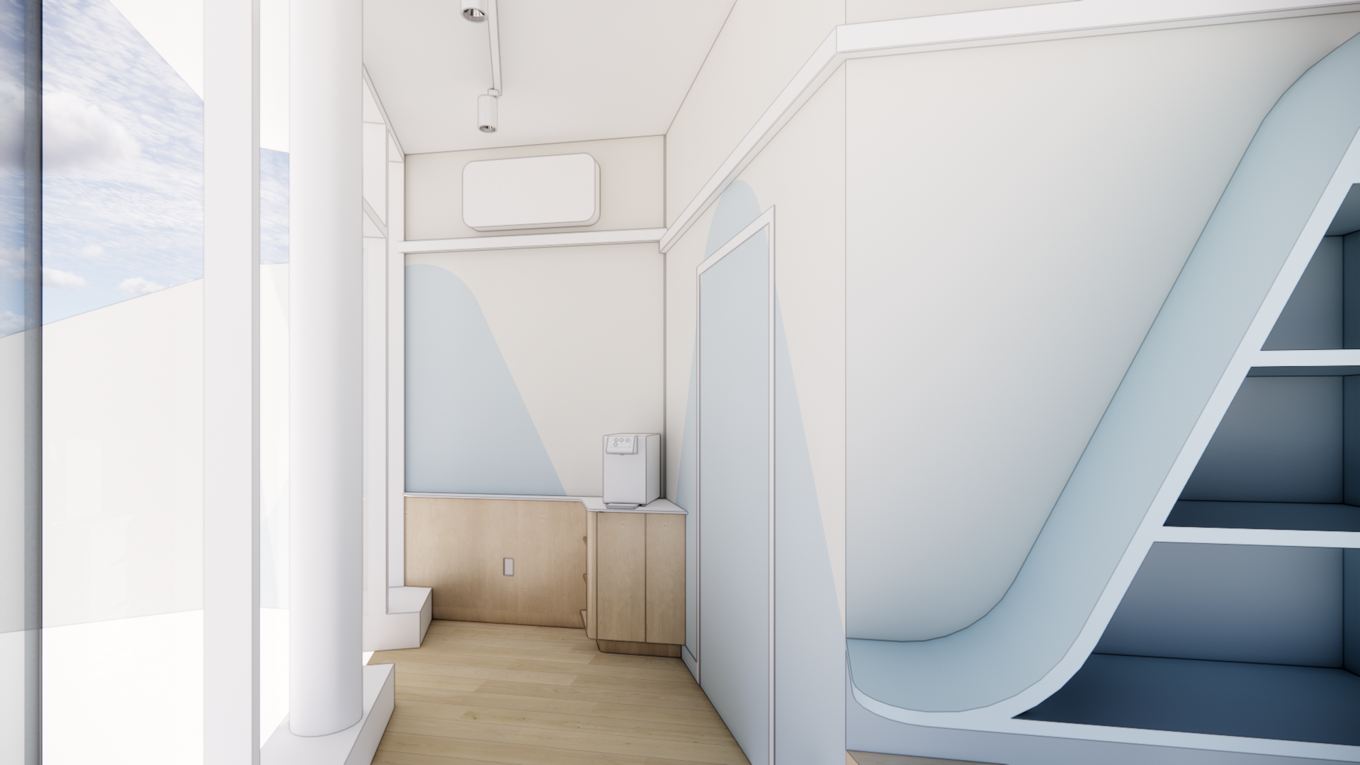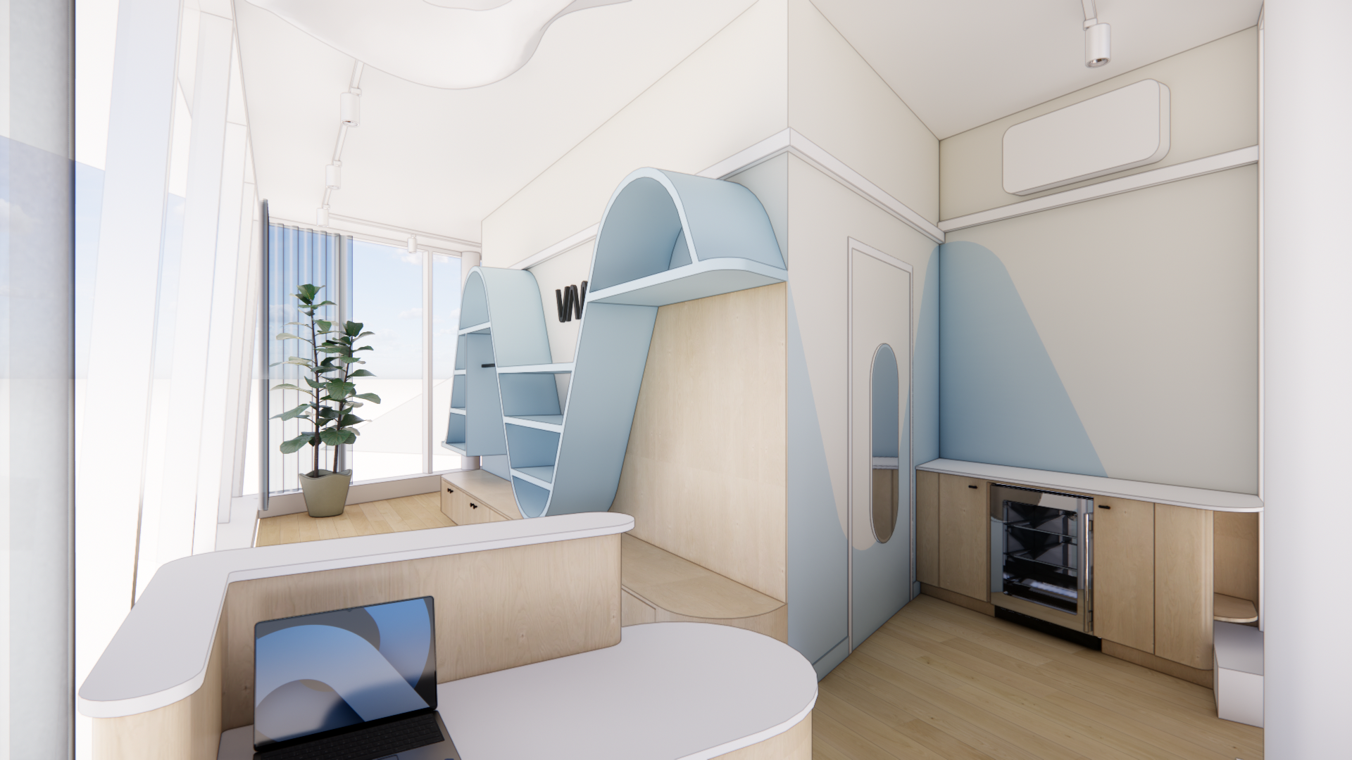 That idea of movement became one of the most defining design moves in the space. Instead of relying on signage or decals, we pulled the wave from the Vamos logo and translated it directly onto the interior walls. The painted “bounce” meets you when you arrive and stays with you as you check in, browse, and head toward the courts. To make it feel intentional, the curve was mapped across the full back wall—unfolded, plotted, and documented with clear reference points so it wraps seamlessly across corners and transitions. Paint let us carry the brand’s motion through the architecture in a way that’s precise, flexible, and integrated—without needing heavy construction to make the statement.