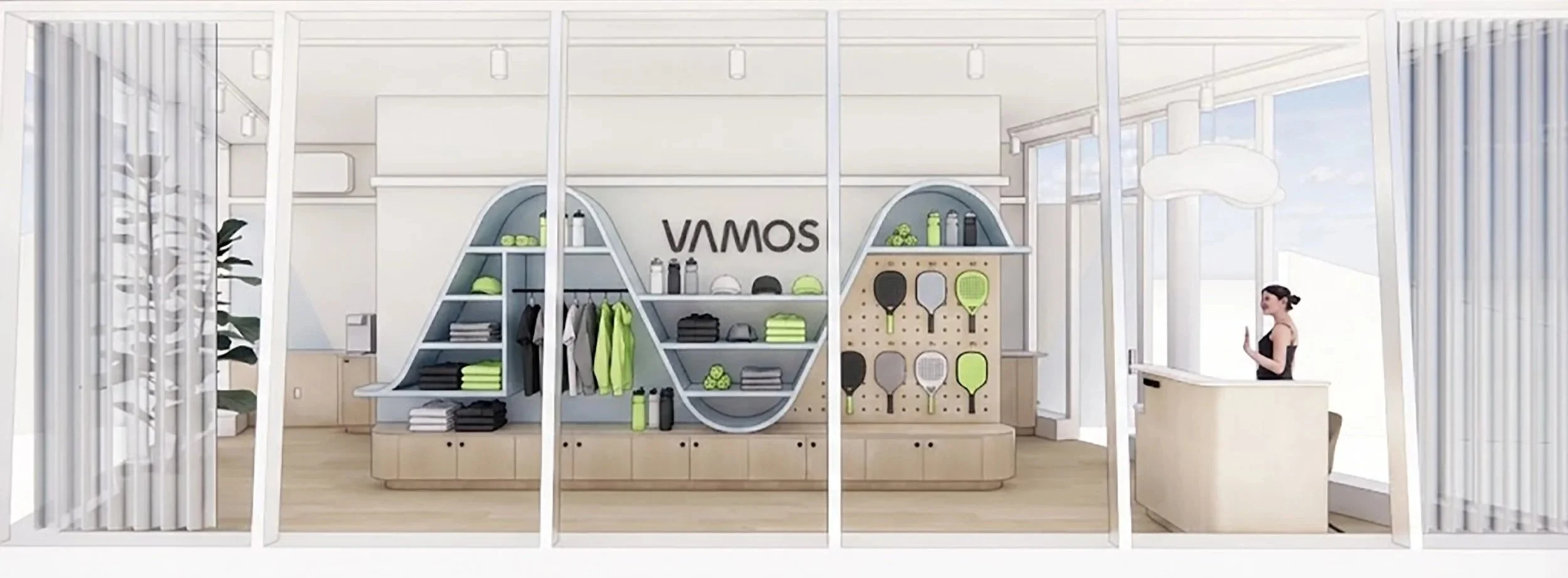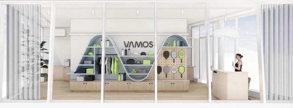 Vamos is built around movement, community, and making racquet sports feel accessible—whether you’re brand new or there every week. The Welcome Hut is the first interior space designed for the brand, acting as the front door to that experience. From the start, we weren’t trying to create a traditional retail moment. We focused on how it should feel: open, energetic, easy to move through—with a bit of whimsy that matches the constant motion of the sport and the people in it.